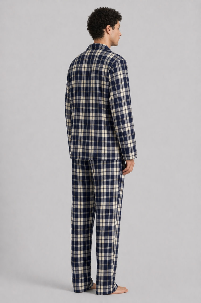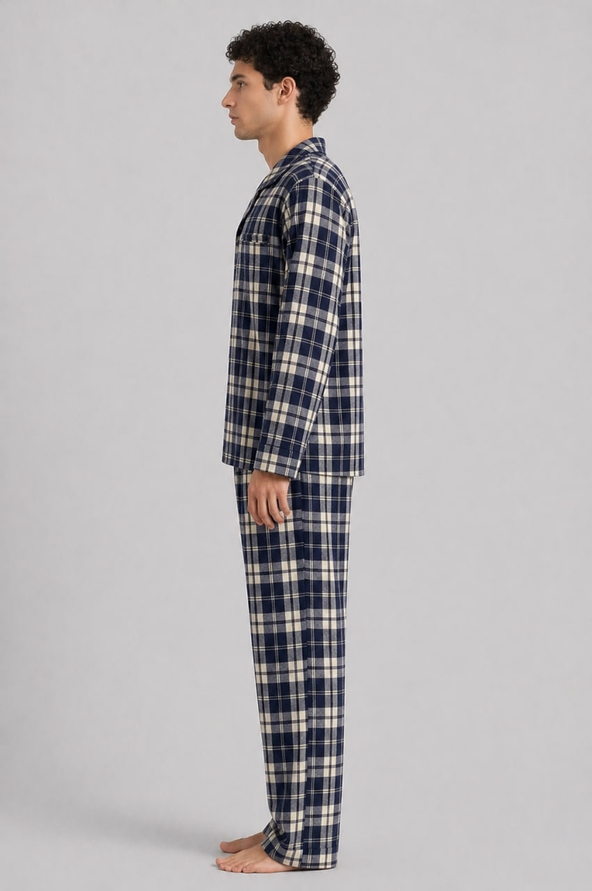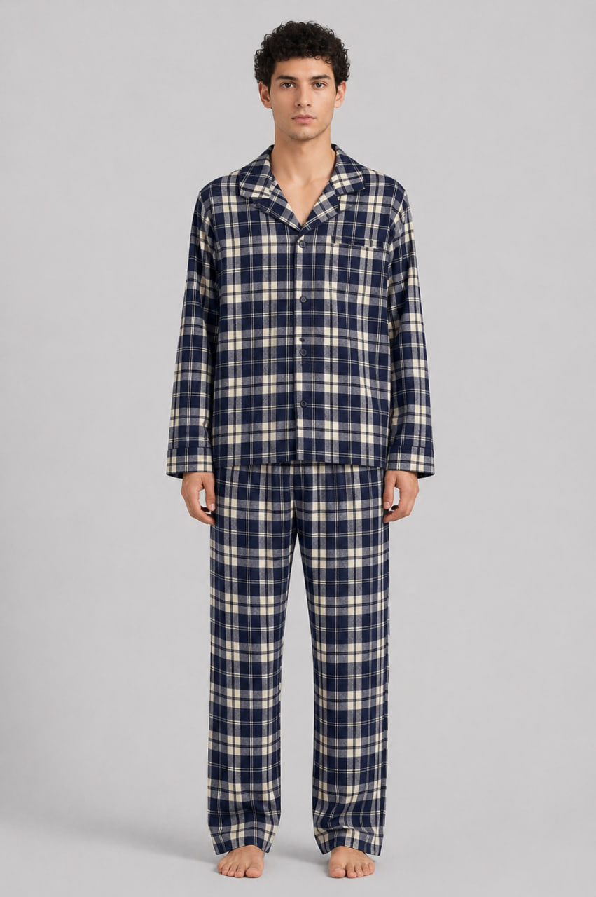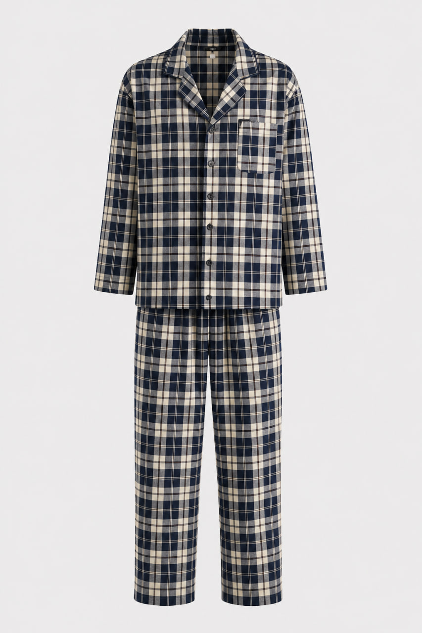 Додайте до свого домашнього гардероба класичну елегантність із чоловічою піжамою від українського бренду BO.Brand. Гармонійне поєднання глибокого синього та м’якого бежевого кольорів у стриманому принті в клітинку створює шляхетний та затишний образ.