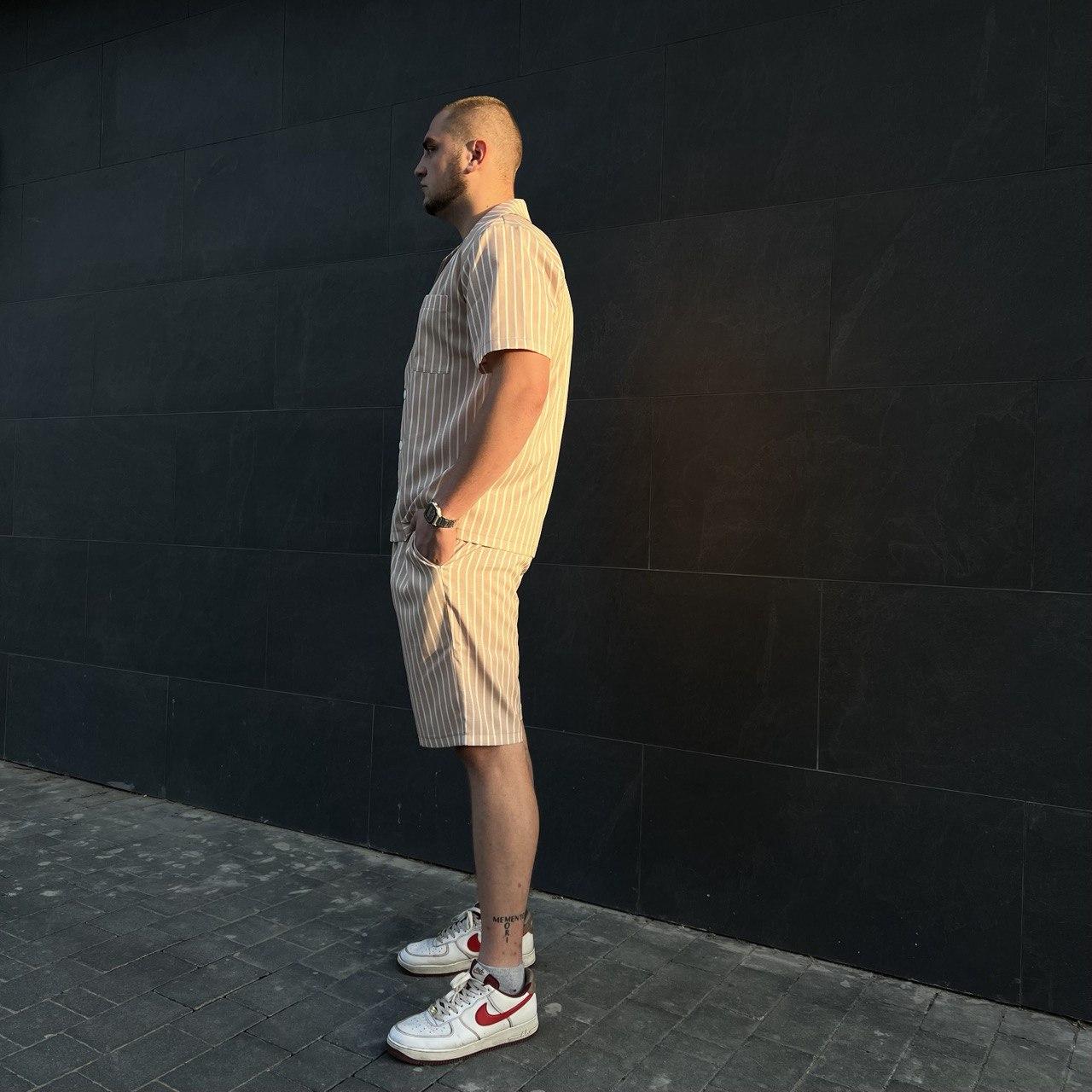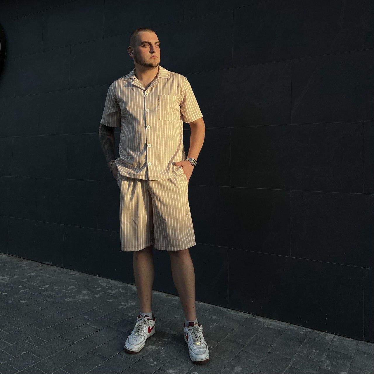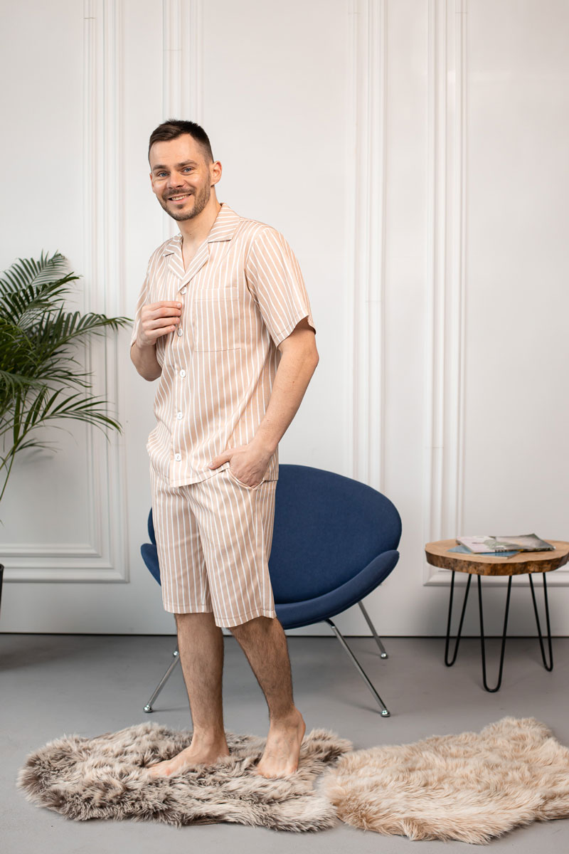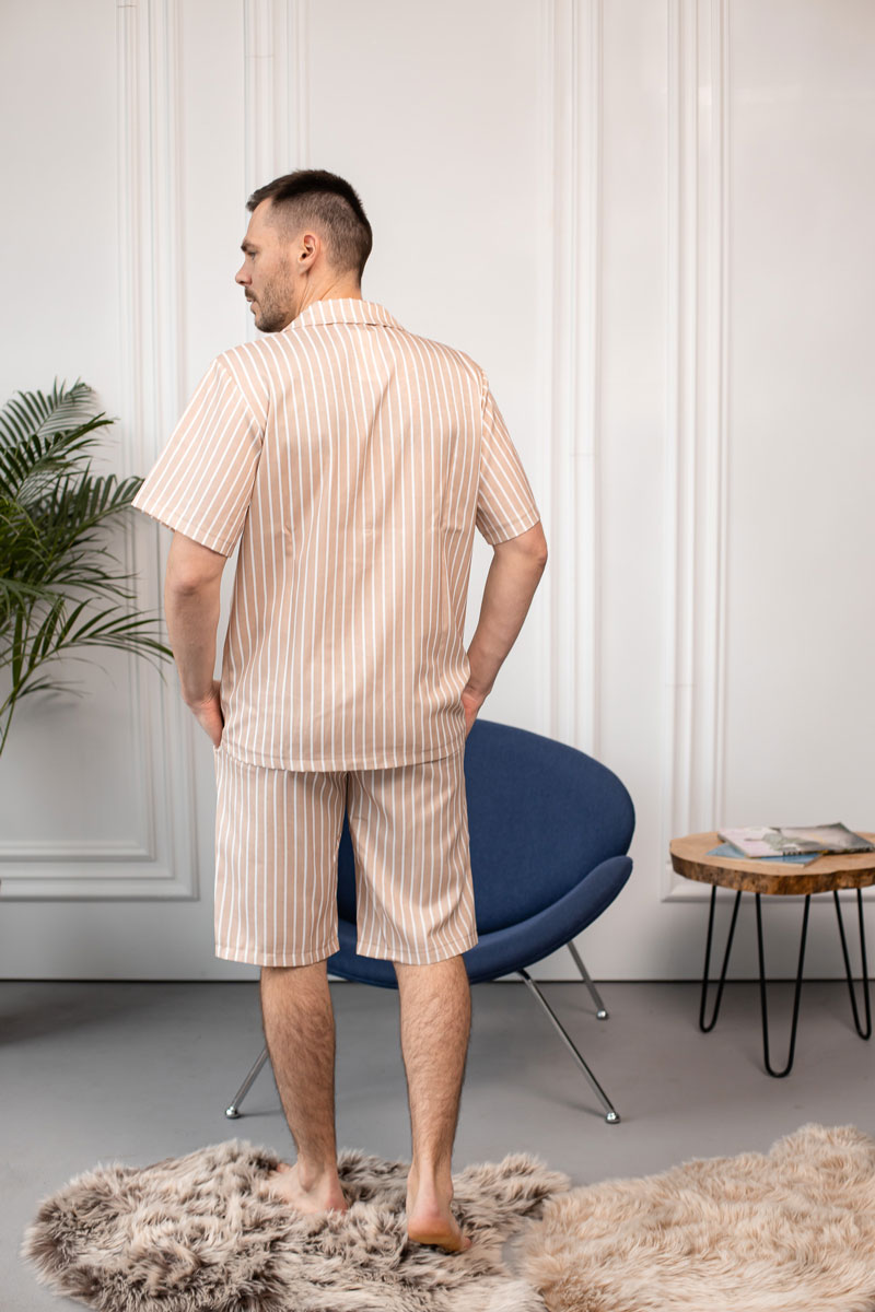 Чоловіча піжама двійка BO.Brand – це найкращий спосіб зануритися у світ комфорту і стилю, коли ви вдома. Ця розкішна двійка складається з сорочки та шортів, і вона точно вражає своєю смужкою відтінку бежевого.
