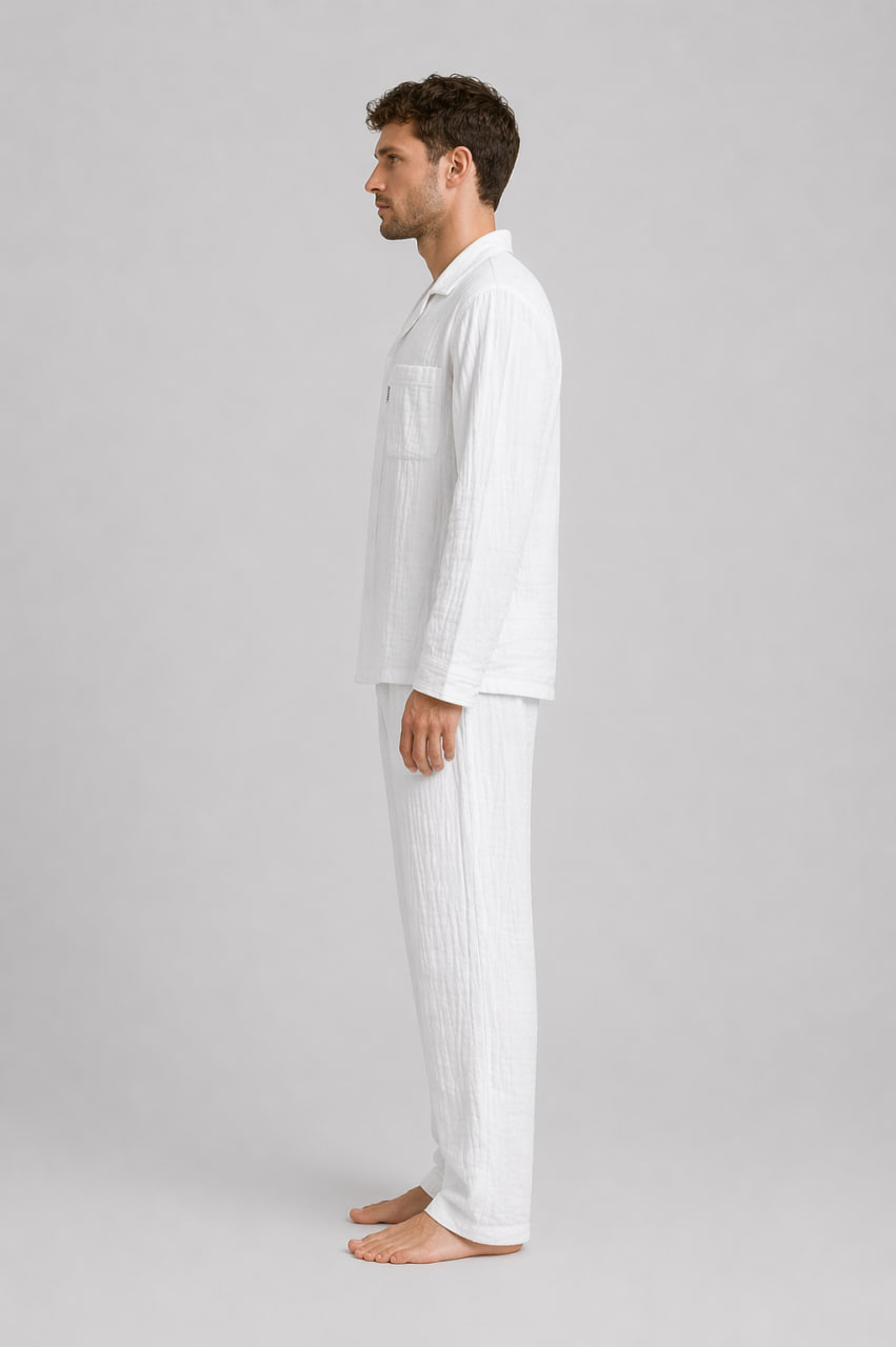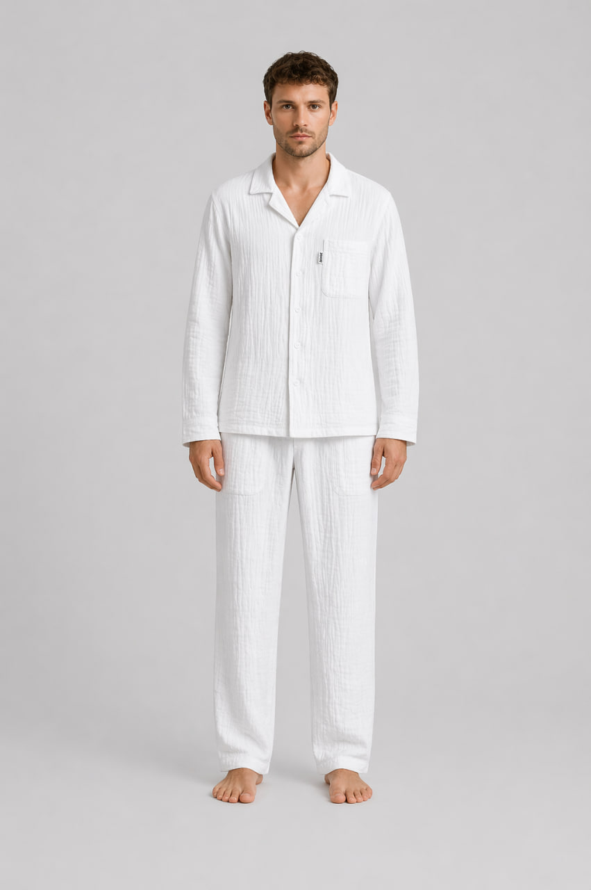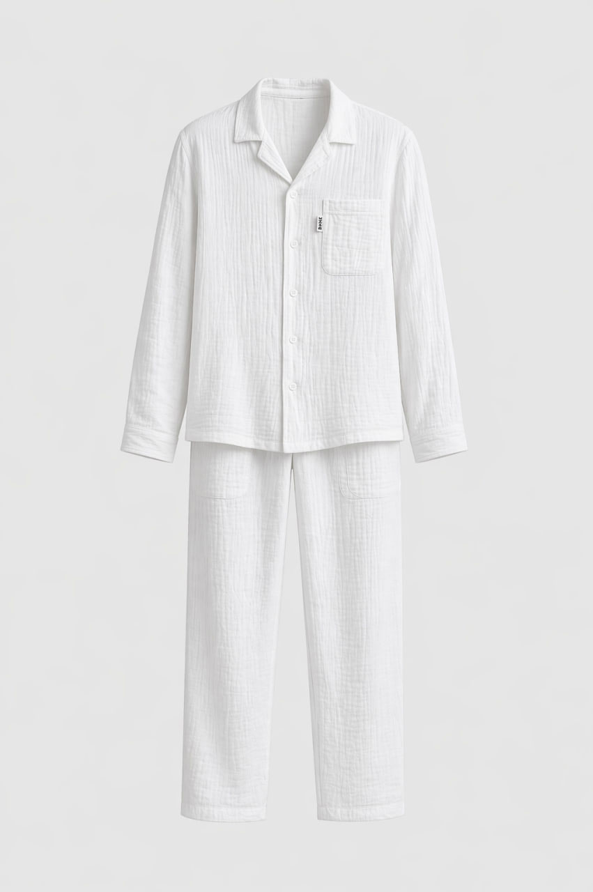 Відчуйте невагомість та абсолютну чистоту з новою моделлю від BO.Brand. Біла муслінова піжама — це вибір чоловіків, які цінують естетику мінімалізму та максимальний комфорт під час сну та домашнього дозвілля.