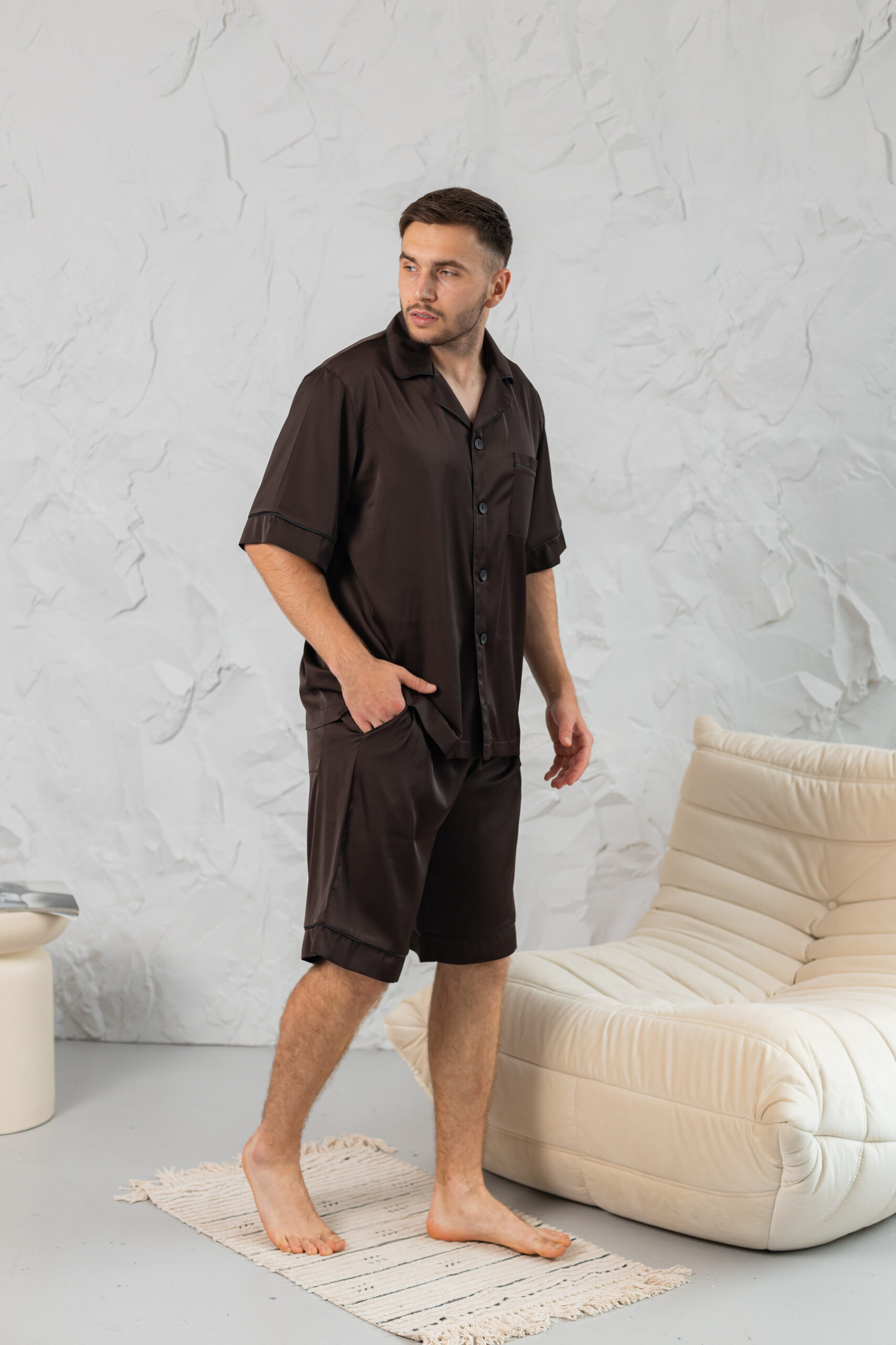 Піжама чоловіча BO.Brand колір коричневий — зануртесь у світ найкращого комфорту і стилю з нашою чоловічою шовковою піжамою! Ця домашня модель вражає якістю та елегантністю, пропонуючи неперевершений відпочинок і відчуття задоволення від кожної миті вашого дому.