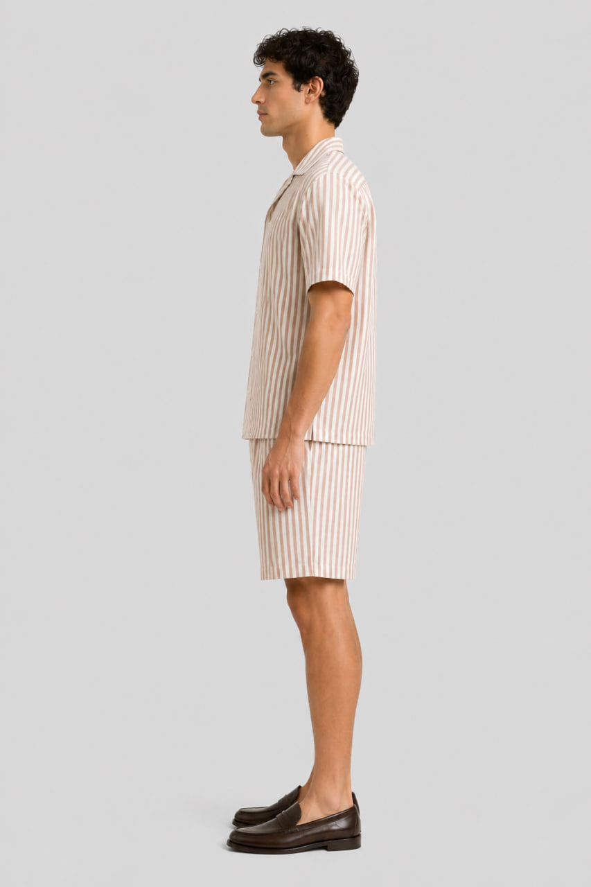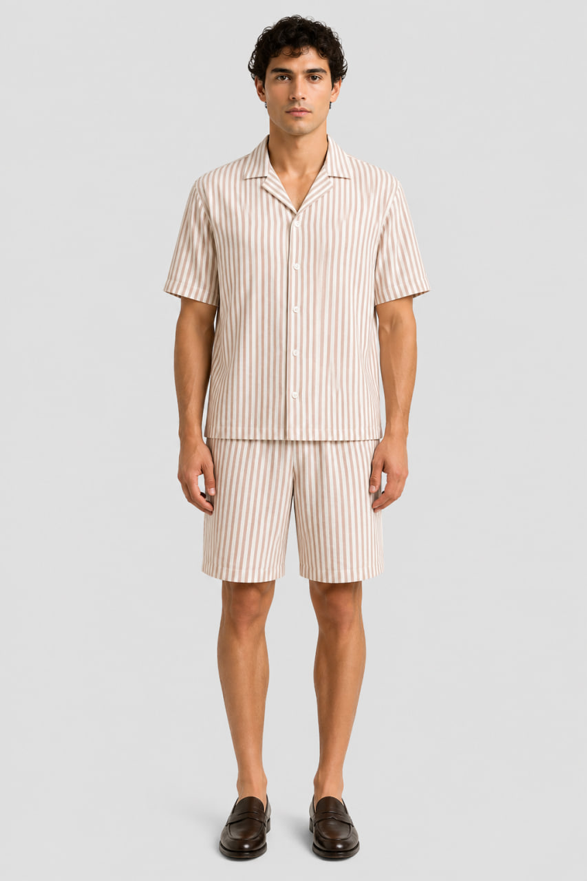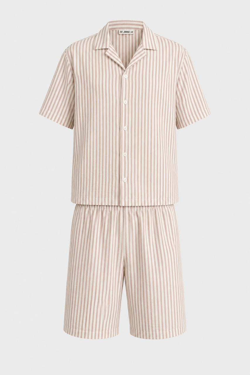 Головна » Магазин » Одяг для чоловіків » Піжами та костюми » Чоловічий лляний костюм у бежеву смужку (сорочка та шорти) BO.Brand
