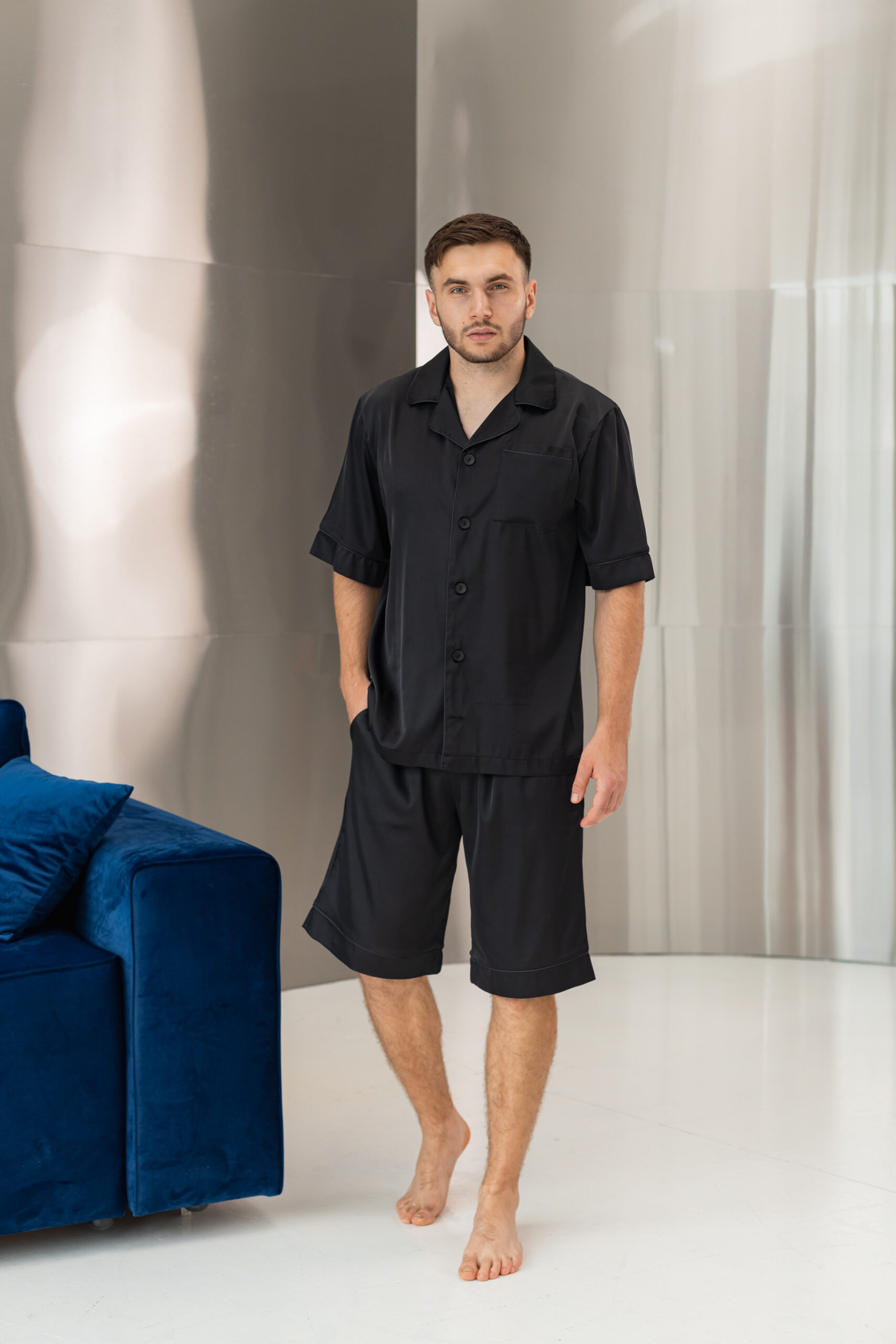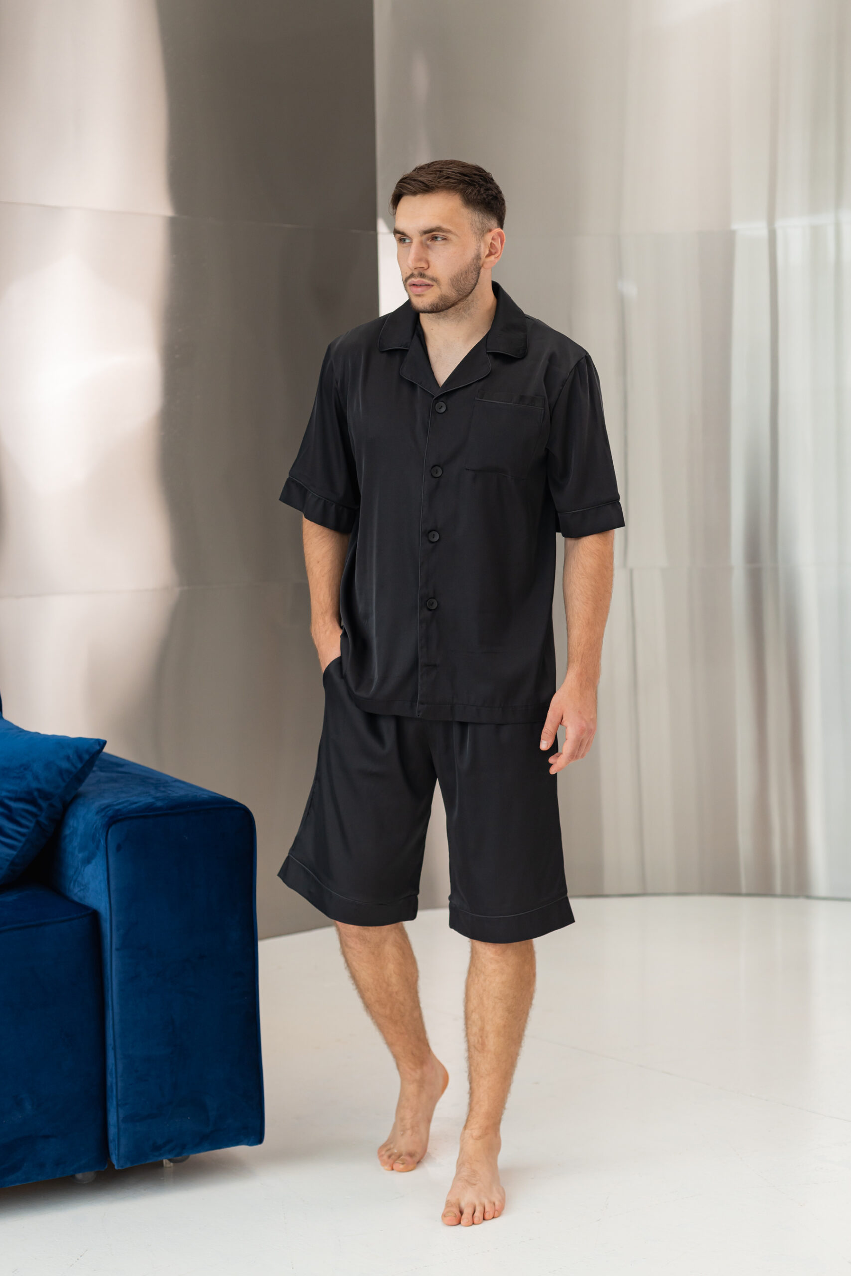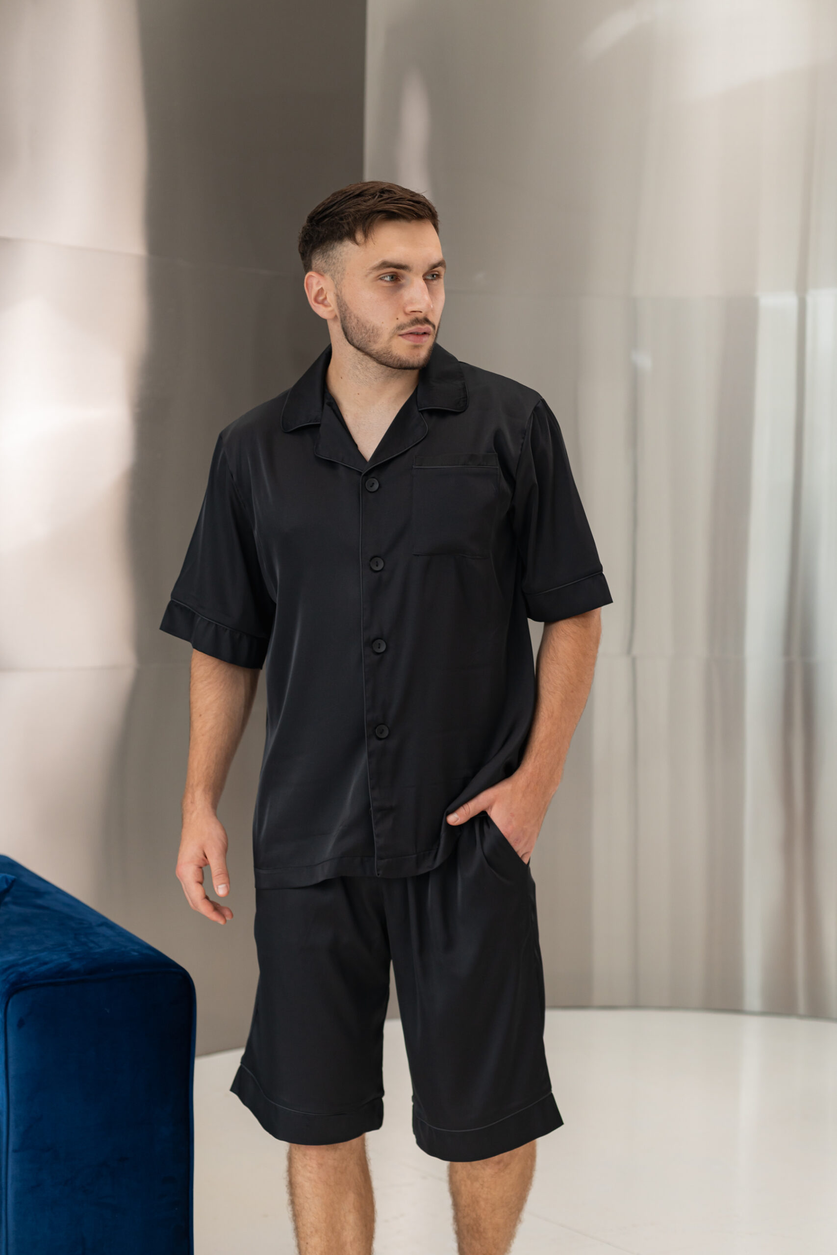 Піжама чоловіча шовкова BO.Brand шорти і сорочка в чорному кольорі