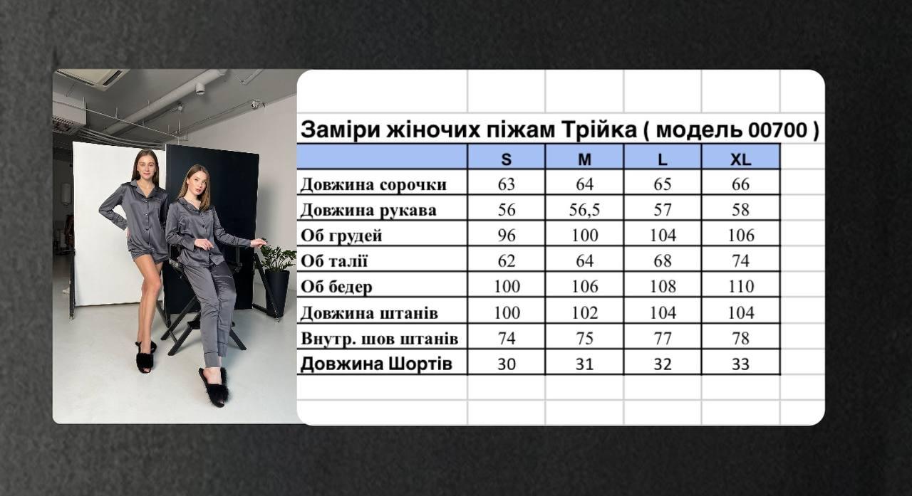 Складається з сорочки, штанів і шортів, цей набір дозволяє вам вибрати зручний стиль для кожного моменту вашого дня. Сорочка забезпечує елегантний і розкішний вигляд, штани — максимальний комфорт під час релаксу вдома, а шорти — ідеальний варіант для спекотних літніх ночей.