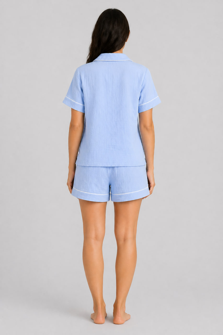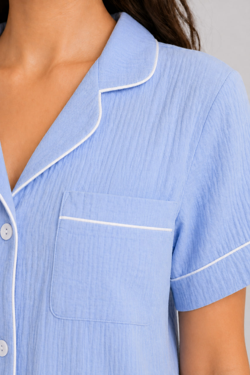 Будьте чарівною навіть уві сні! Замовляйте блакитну піжаму з преміального мусліну із сорочкою та шортами від BO.Brand — ви на це заслуговуєте.