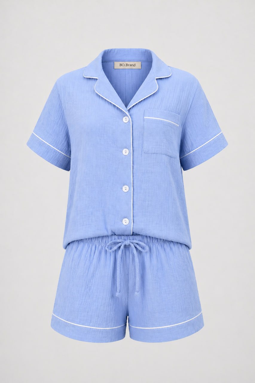 Ми створили цю піжаму для тих, хто цінує естетику «Pinterest style» у поєднанні з безкомпромісною якістю. Блакитний мусліновий комплект від BO.Brand ідеально підходить для спекотних літніх ночей, ранкової кави на терасі або затишних домашніх вечорів.