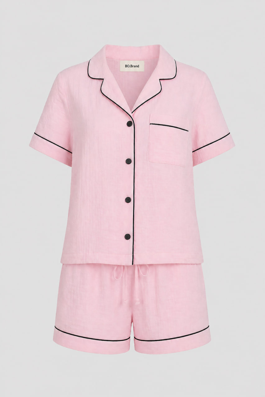 Ми створили цю піжаму для тих, хто цінує естетику «Pinterest style» у поєднанні з безкомпромісною якістю. Рожевий мусліновий комплект від BO.Brand ідеально підходить для спекотних літніх ночей, ранкової кави на терасі або затишних домашніх вечорів.