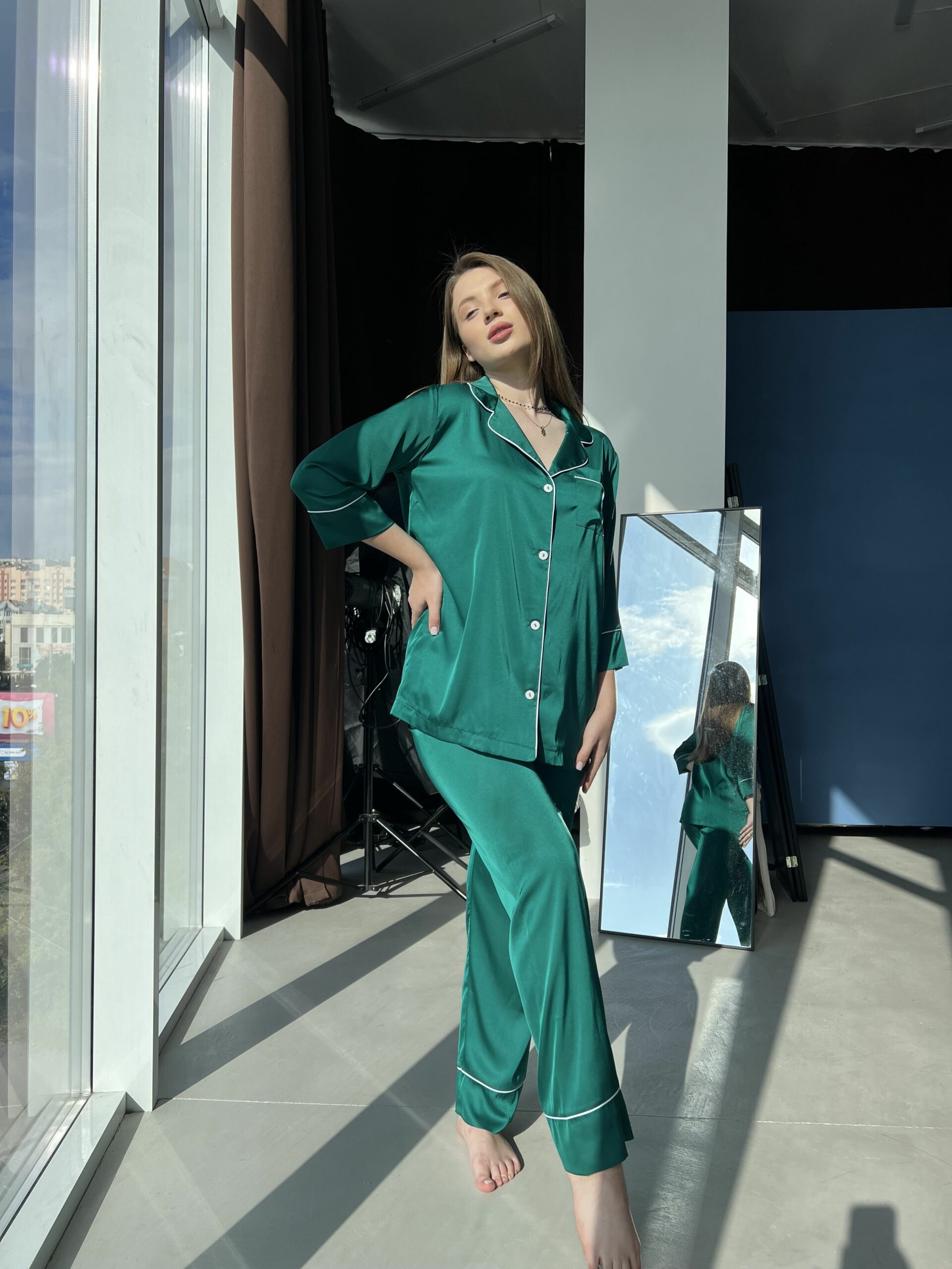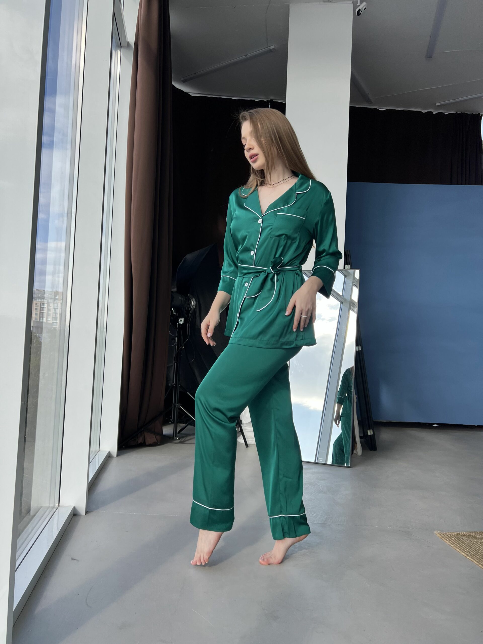 Жіноча шовкова піжама BO.Brand зеленого кольору (сорочка з поясом та штани)