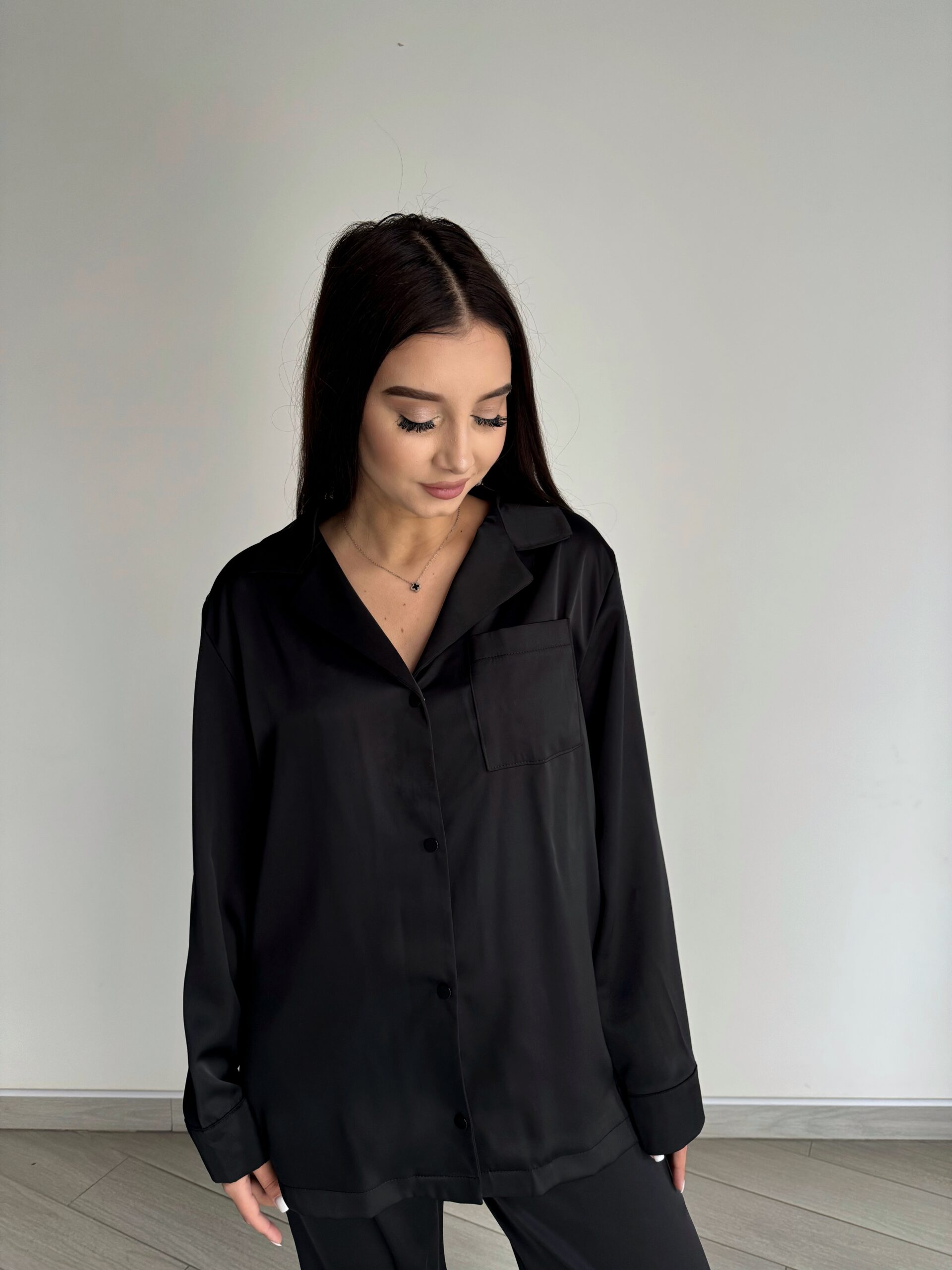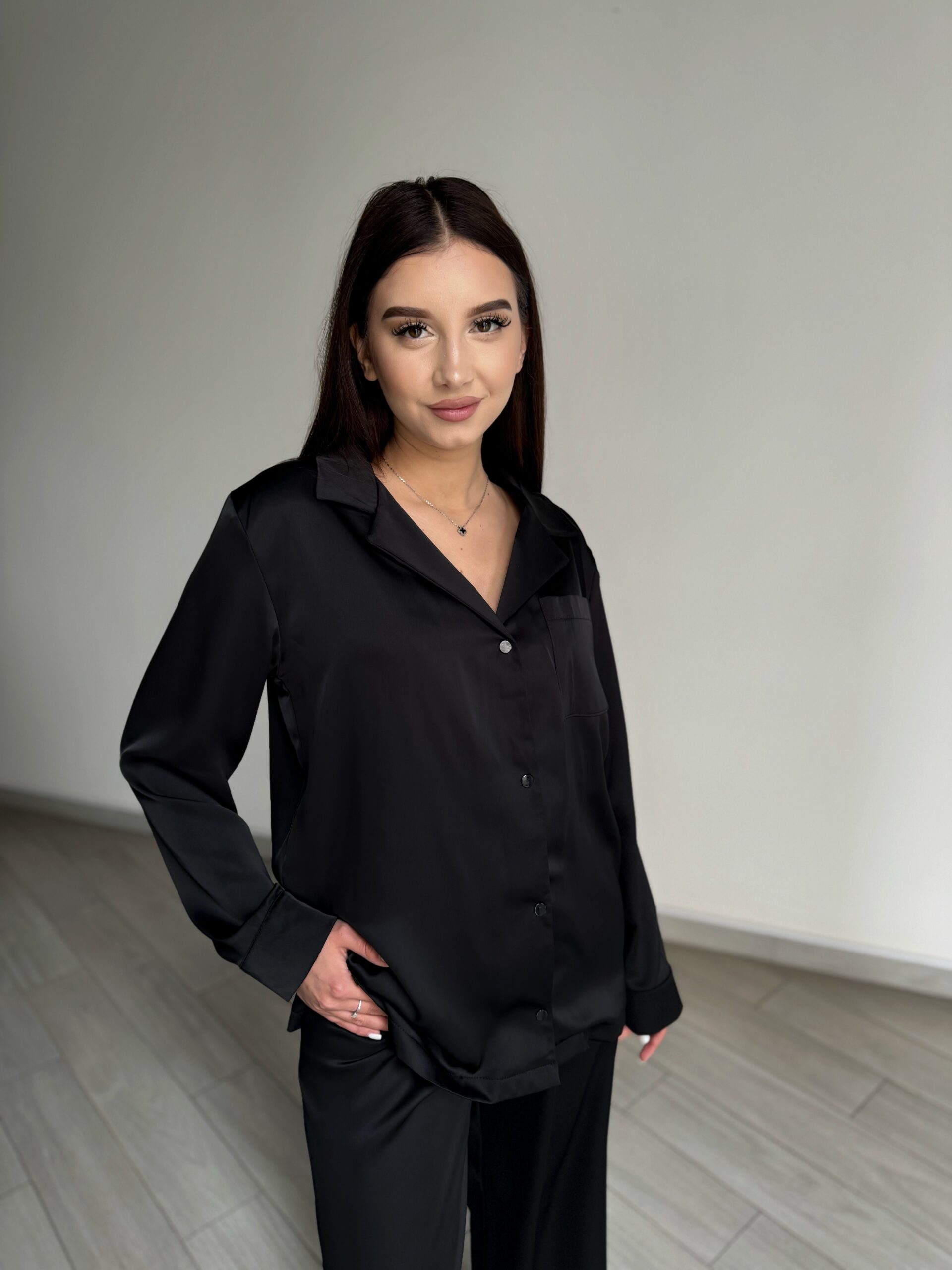 Жіноча сатинова піжама BO.Brand – це витончена симфонія комфорту і стилю, яка зачаровує своєю елегантністю та практичністю. Ця чорна піжама має сорочку та штани з ніжного шовку, створюючи найкращий сполучення розкішної дотику до тіла та бездоганного дизайну.